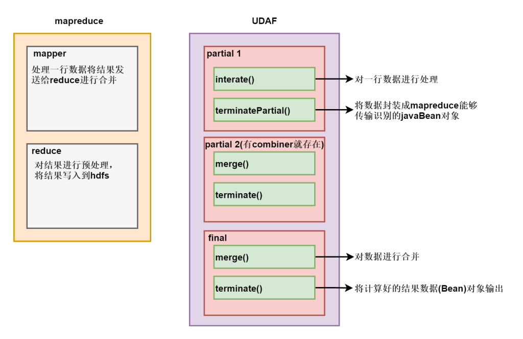 PARTIAL1: 这个是mapreduce的map阶段:从原始数据到部分数据聚合,将会调用iterate()和terminatePartial()