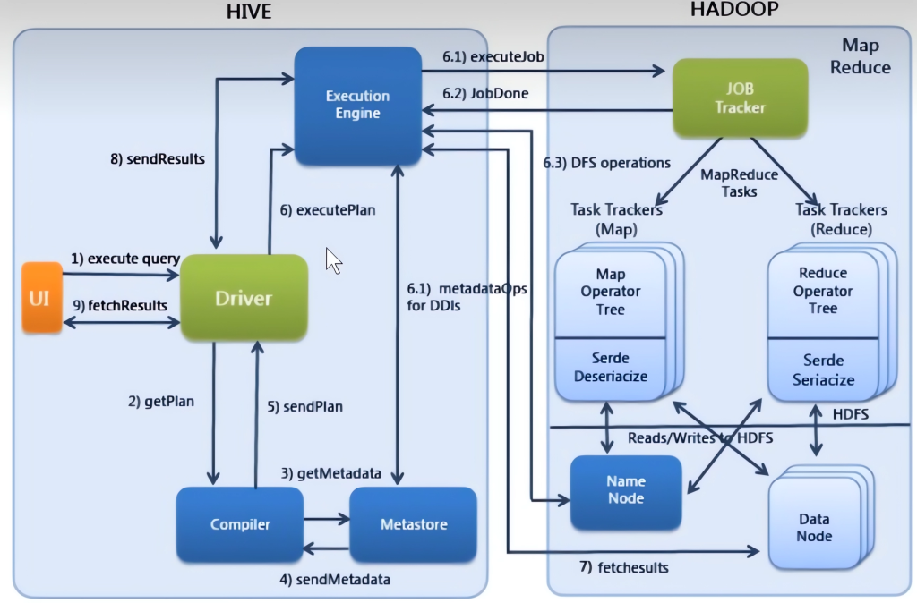- Execute Query:hive界面如命令行或Web UI将查询发送到Driver(任何数据库驱动程序如JDBC、ODBC,等等)来执行。