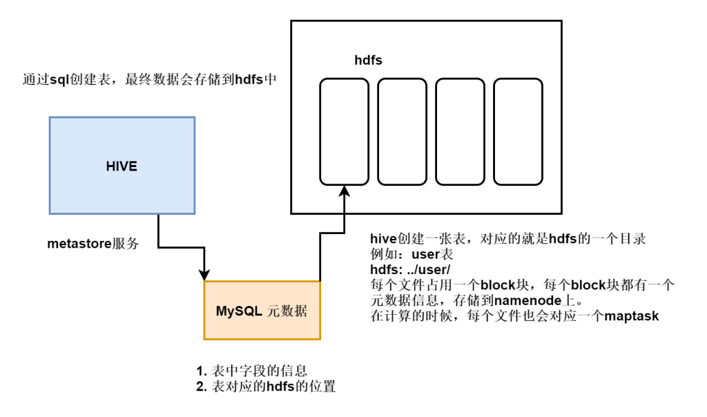 元数据:hive表所对应的字段、属性还有表所对应存储的HDFS目录。