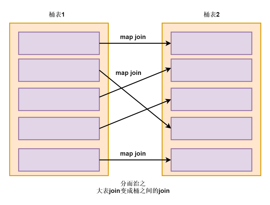 桶可以保证相同key 的数据都分在了一个桶里,这个时候我们关联的时候不需要去扫描整个表的数据,只需要扫描对应桶里的数据(因为key 相同的一定在一个桶里),smb的设计是为了解决大表和大表之间的join的,核心思想就是大表化成小表,然后map join 解决是典型的分而治之的思想。