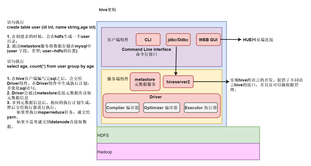Driver组件:该组件包括Complier(编译)、Optimizer(优化)和Executor(执行),它的作用是将HiveQL(类SQL)语句进行解析、编译优化,生成执行计划,然后调用底层的MapReduce计算框架。