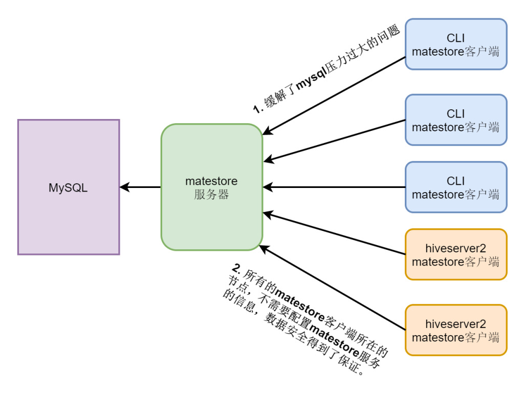 Metastore组件:元数据服务组件,这个组件存取Hive的元数据,Hive的元数据存储在关系数据库里,Hive支持的关系数据库有Derby和Mysql。作用是:客户端连接metastore服务,metastore再去连接MySQL数据库来存取元数据。