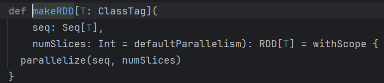 parallelize 和makeRDD是一个算子,makeRDD其实就是parallelize,查看源码可以看到,如下: