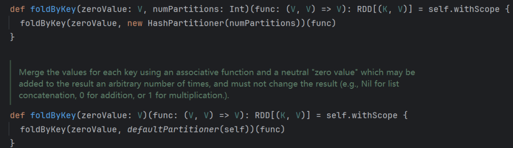 和reduce一样,给定初值,每个分区计算时都会使用此初值。与groupByKey不同的是,除了每个分区有初始化值,整体也会有一个初始化值。