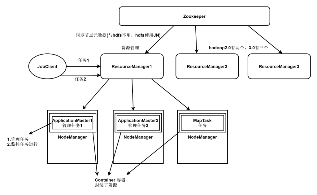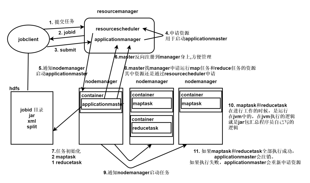 hdfs负责数据分布式存储,mapreduce负责数据分布式计算,但是也限制了对于数据计算只能用mapreduce,扩展性不好。在hadoop2.0中引入了yarn