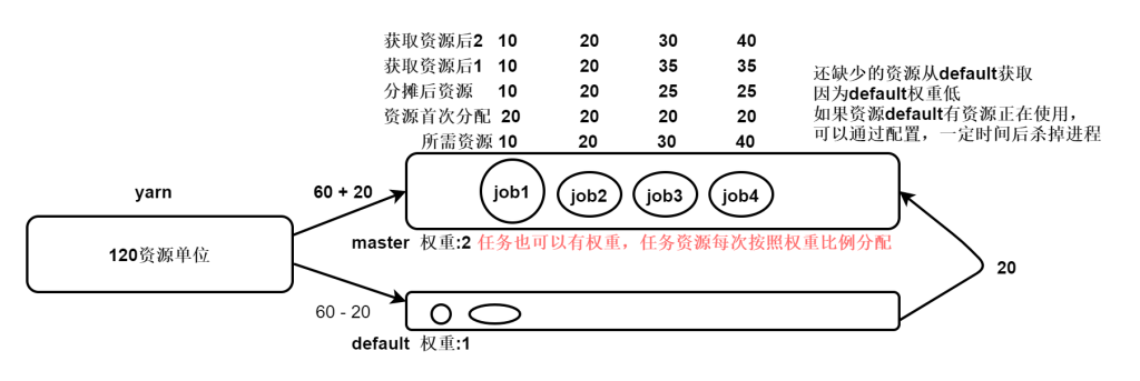 <!-- 如果一个队列在该段时间内使用的资源量低于fair共享资源量,则开始抢占其他队列的资源。-->