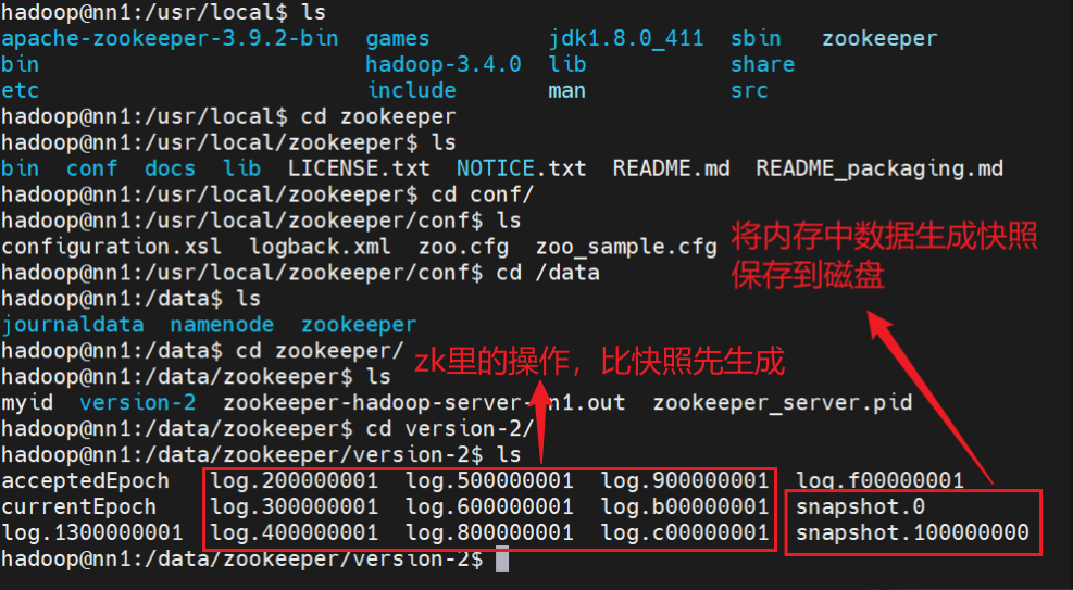 Zookeeper的树状结构是维系在内存中的,即每个节点中的数据是维系在内存中,这样做的目的是方便快速查找,同时Zookeeper的树状结构也会以快照的形式维系在磁盘上,在磁盘上存储位置由dataDir和dataLogDir属性来决定,这两个位置都是在zoo.cfg中配置的。