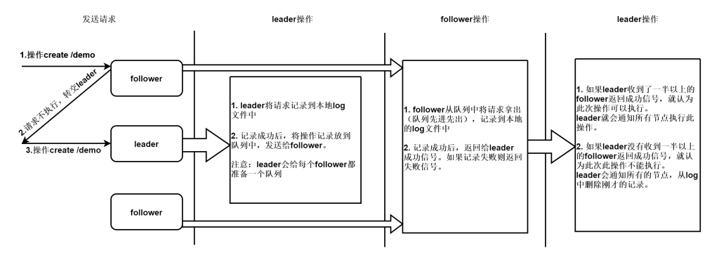- 每一个follower在收到队列之后,会从队列中依次取出事务Proposal,写到本地的事务日志中。如果写成功了,则给leader返回一个ACK消息